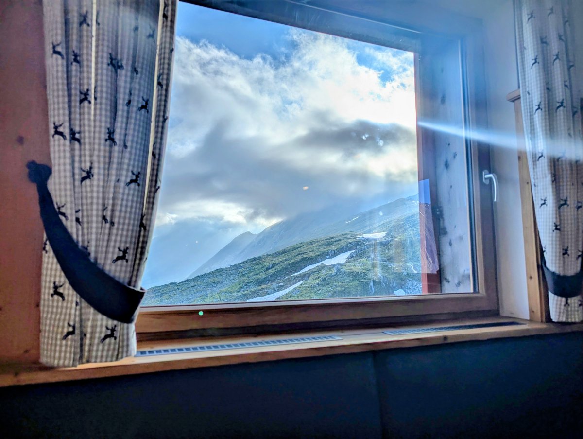 Am späten Nachmittag drehe ich noch eine Runde ums Haus und erkunde die Umgebung um die Hütte. Die Hüttenwirte sind freundlich und hilfsbereit, doch man spürt, wie touristisch es hier oben ist. Eine klassische Hütte ist dies aus meiner Sicht nicht. Denn Sauna und Duschen sind vorhanden und inklusive. Auch beim Abendessen sitzt jede Gruppe oder Person für sich wie im Restaurant und es kommt zu keinem Austausch mit anderen Gästen. Einzig mit meinen vier Zimmergenossen komme ich ins Gespräch.. Sabrina mit ihrer Freundin, die eine Woche mit ihrem Rad unterwegs ist, Thorsten, der zwei Nächte hier bleibt und die Gegend bewandert, sowie Katharina, die übers Fronleichnam-Wochenende wandern geht.