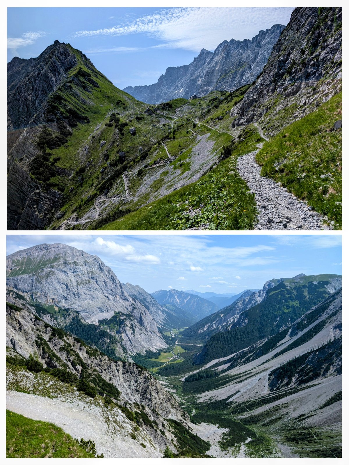 Vom Sattel hinab nach Scharnitz darf ich durch das ewige Karwendeltal absteigen. Zu meiner Linken werde ich immer noch von der Karwendel-Hauptkette begleitet.