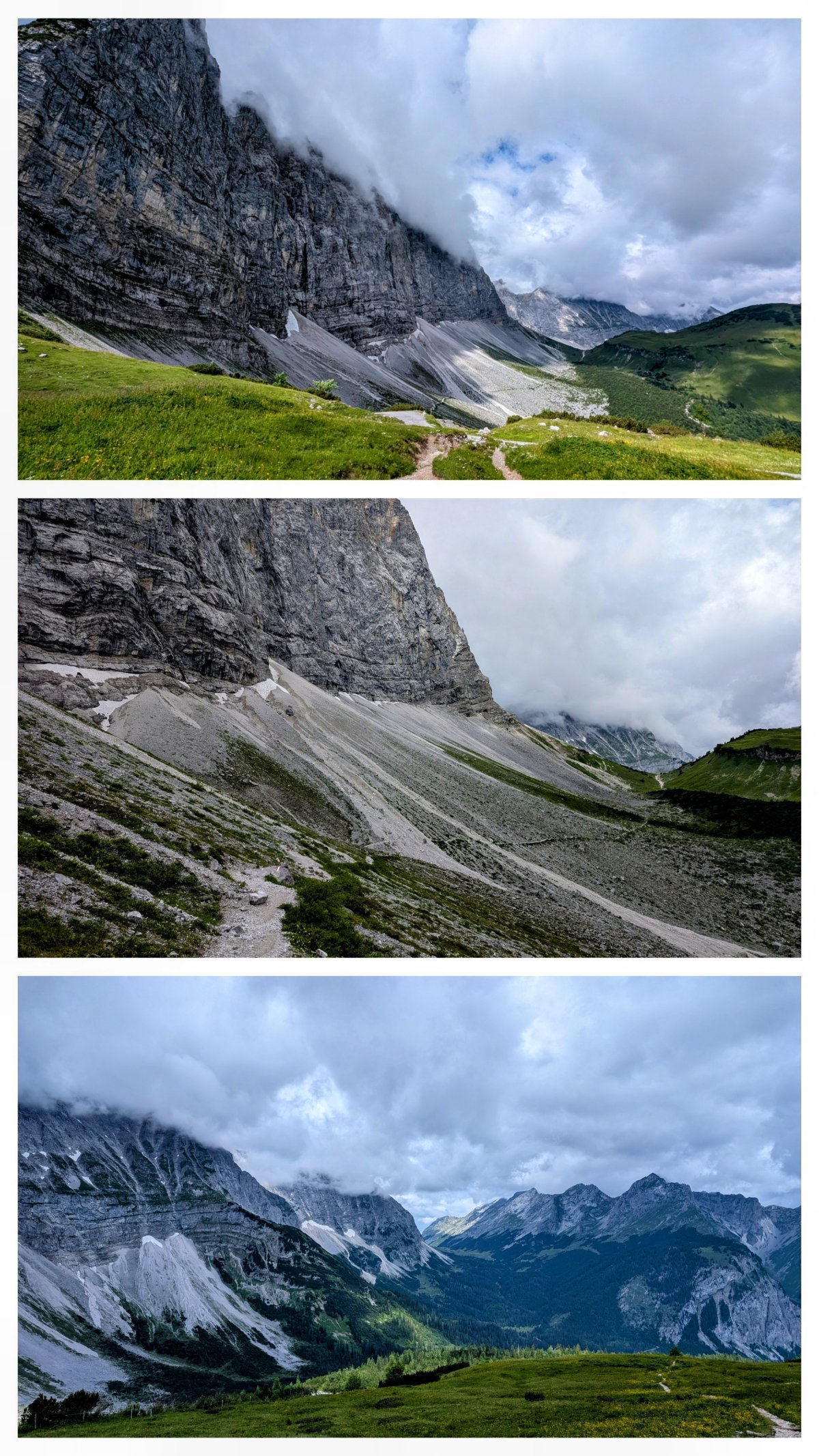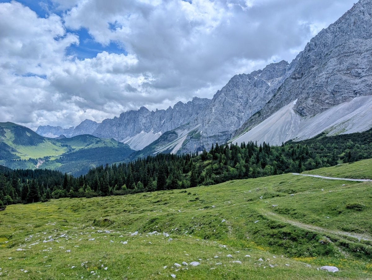 Die Wege führen mich von nun an die nächsten Tage durch den Karwendel Naturpark. Doch zuerst geht’s steil bergauf auf eine Hochebene und dann weiter hinten im Talkessel hinauf zum Lamsenjoch.