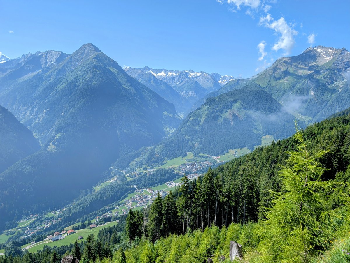 Doch mit schattigem Weg ist nach dem ersten Aufstieg bereits fertig. Der Weg verläuft hauptsächlich weiter über langweilige Forst- und Schotterstrassen bei drückendem Sonnenschein. Auf und Ab entferne ich mich immer mehr vom Haupttal des Zillertals.