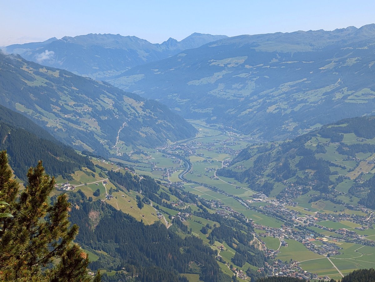 Meine Verbindung fährt zwanzig Minuten später ein und bringt mich mit Zug und Bus zurück nach Finkenberg. Dort starte ich erst morgen wieder, da heute Nachmittag Gewitter angemeldet sind und jetzt bereits schon zwölf Uhr mittags ist. So verbringe ich die Zeit im Hotelzimmer mit Blog schreiben, mich auf die kommenden Etappen vorzubereiten und beobachte das Sommergewitter.