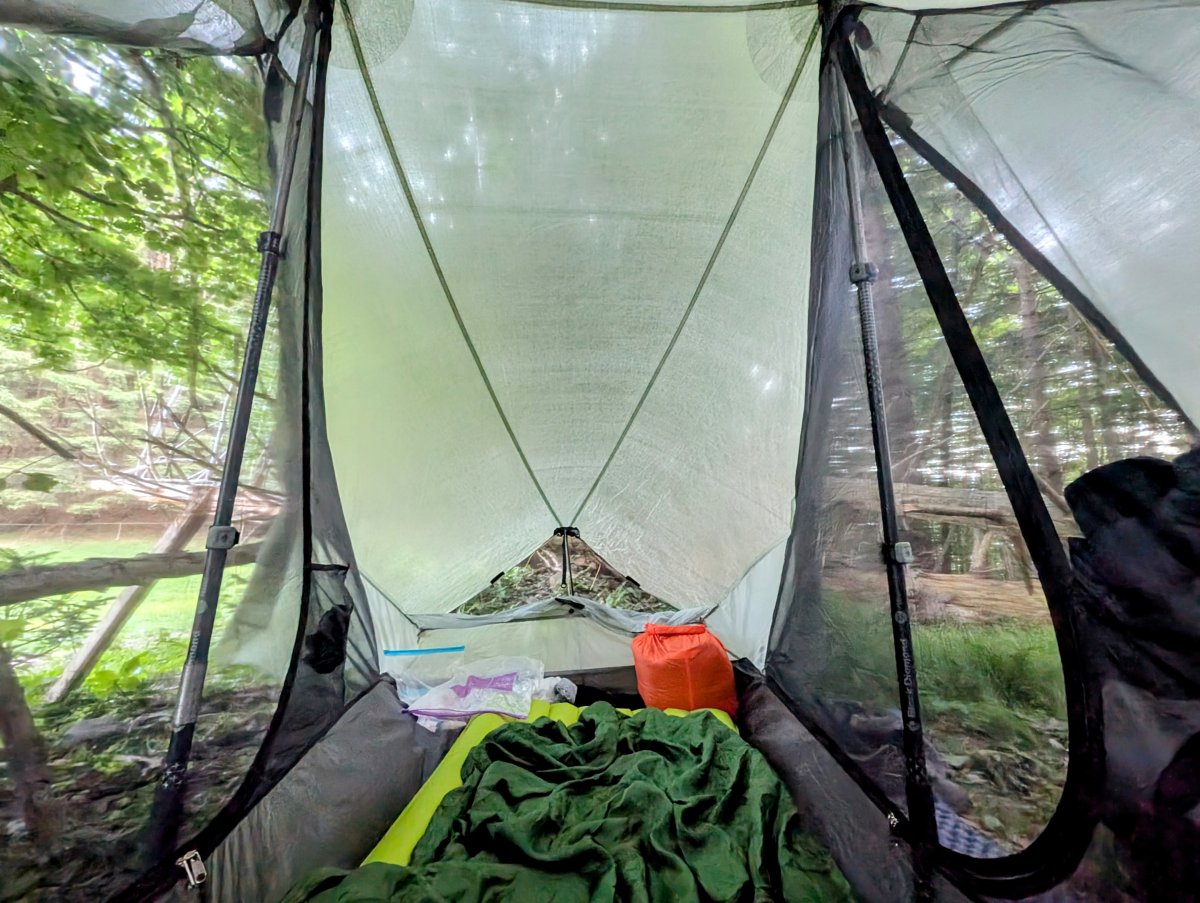 In der Nacht wache ich auf und muss die Kopf- und Fuss-seitigen “Fenster" von meinem Zelt schliessen, da es unerwartet zu regnen beginnt.