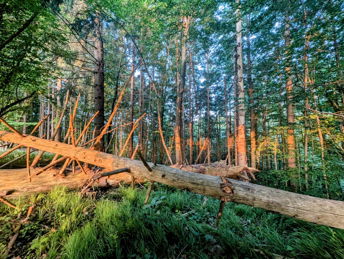 Ich habe trotz Hitze wunderbar geschlafen und erwache kurz nach Sonnenaufgang. Die Sonne blinzelt durch die Wolkendecke und hüllt den Wald zum Frühstück in orangefarbenes Licht.