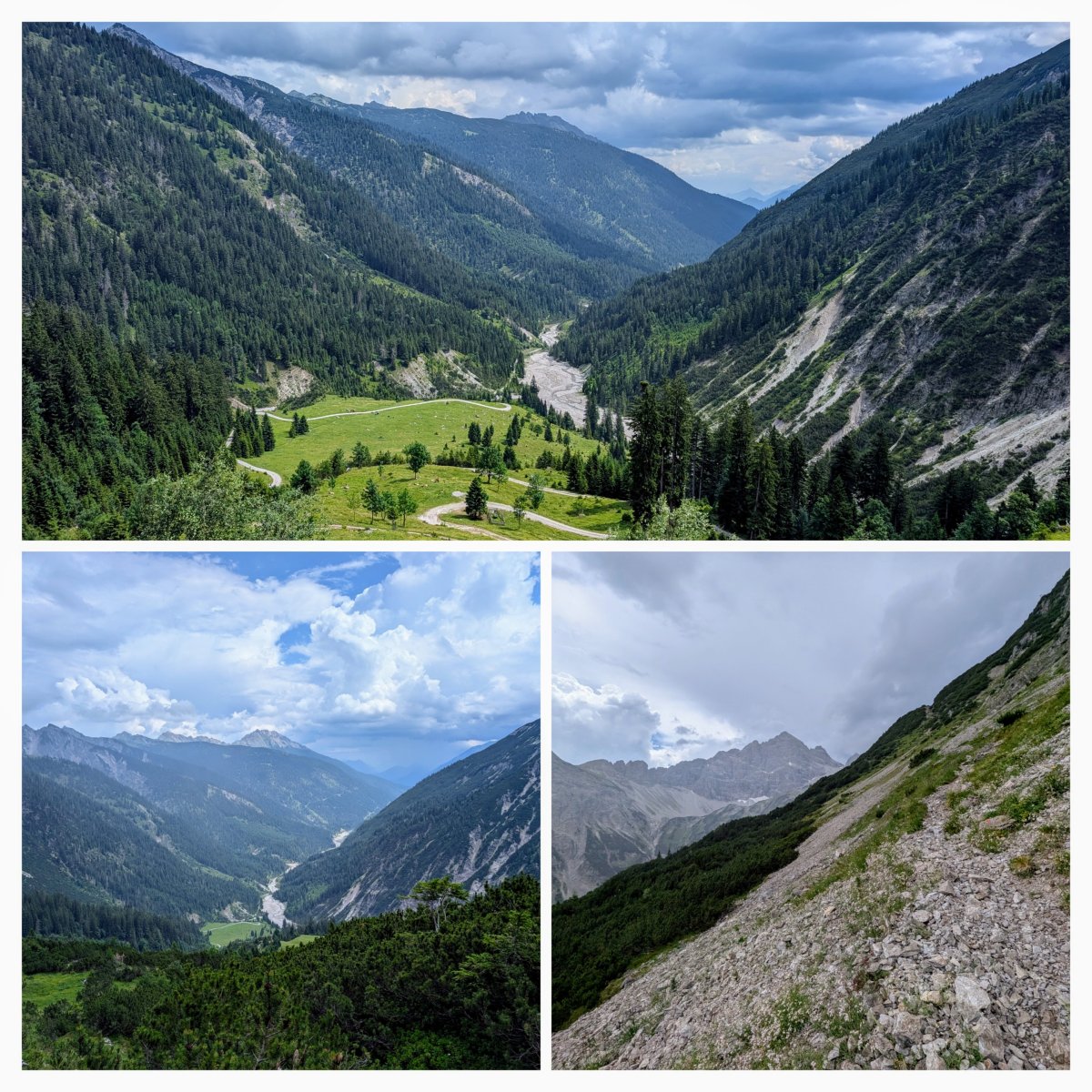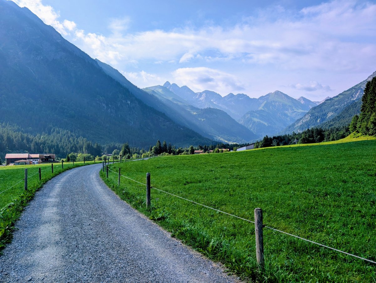 Nach dem Sattel geht's mit rund achtzehn Kilometer hinunter ins Tal. Zuerst steil auf eine Alm hinab und dann immer flacher Richtung Oberstdorf.