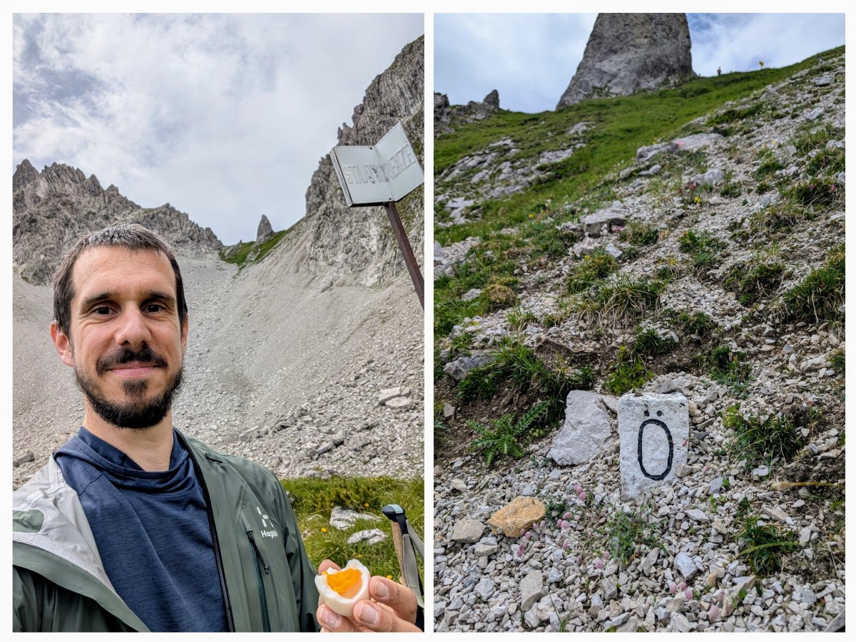 Hundert Höhenmeter unterhalb der Balkenscharte, hört der Nieselregen auf und so gönne ich mir spontan eine Pause und esse ein gekochtes Ei, bevor ich die Grenze zu Deutschland in die Allgäuer Hochalpen überquere.