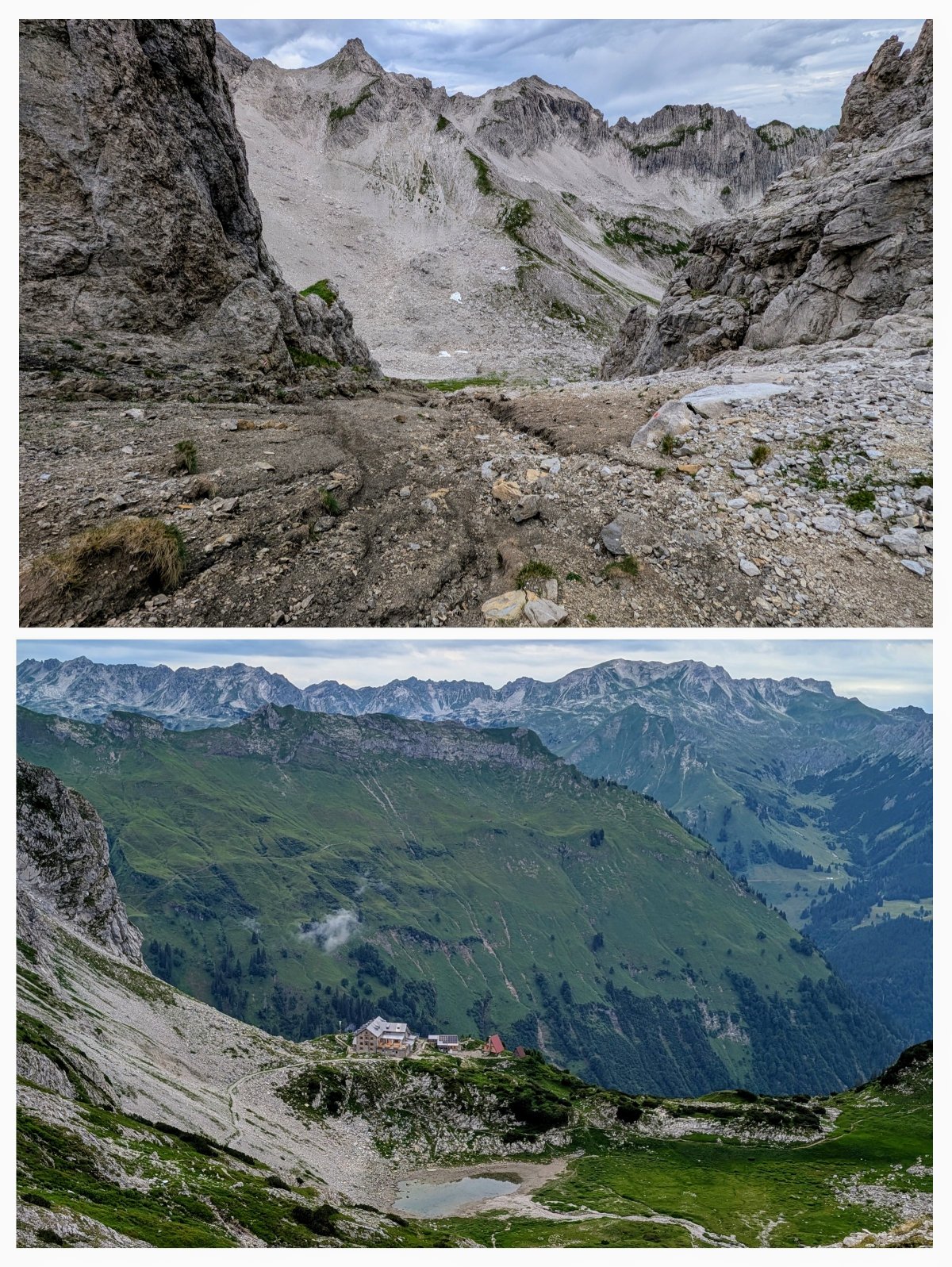 Oben auf der Scharte treffe ich auf eine Wandergruppe, die gerade eben in Richtung der nächsten Hütte abzusteigen beginnt. Ich warte zehn Minuten und steige dann auch ab, doch nach weiteren zehn Minuten habe ich sie schon wieder eingeholt und so unterhalte ich mich beim Absteigen mit dem Bergführer, während die Gruppe hinterher absteigt.
