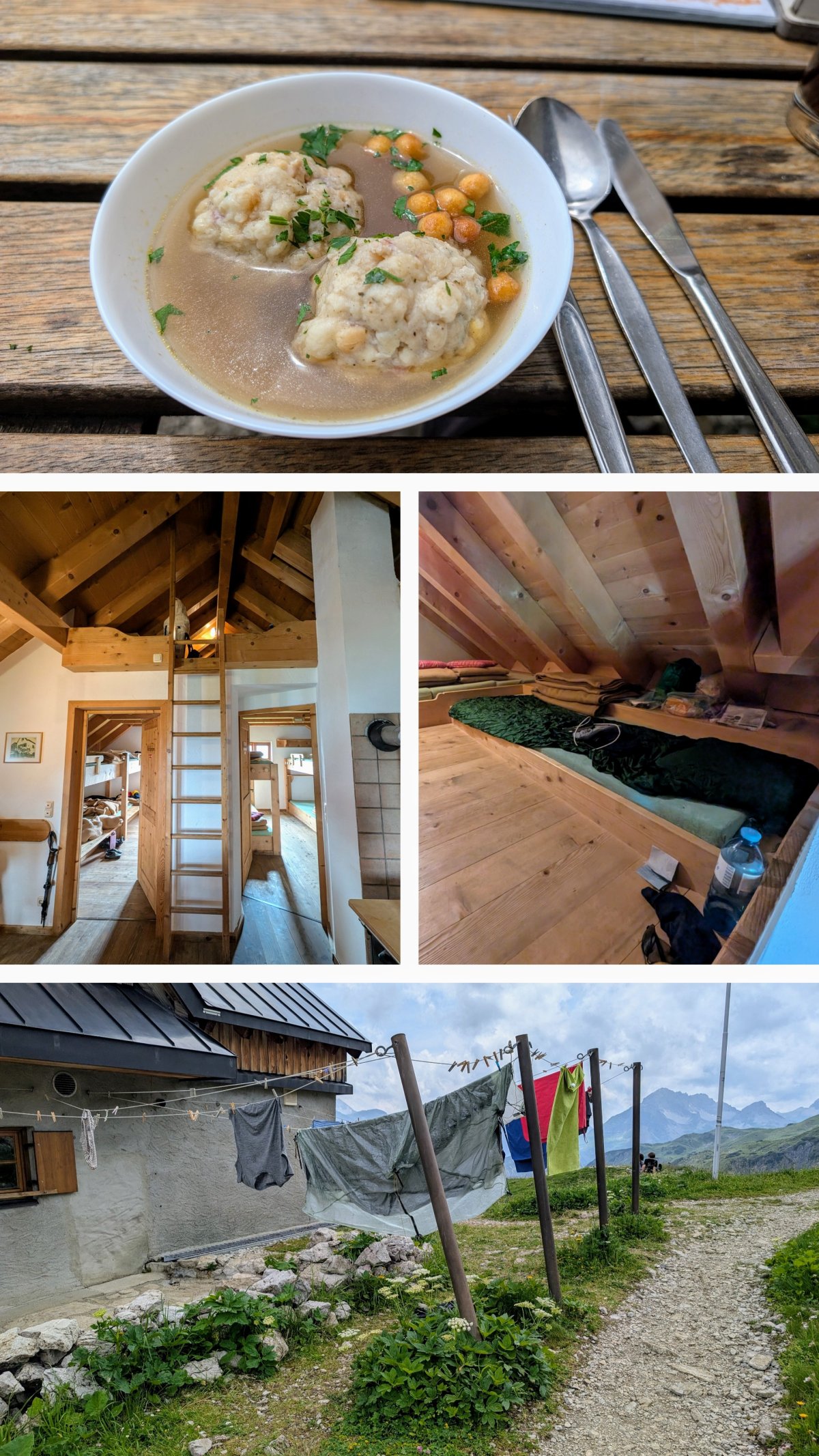 Oben bei der Hütte angekommen, bestelle ich mir eine Knödelsuppe und frage nach einem freien Platz für eine Übernachtung. Die Chefin nimmt sich Zeit für mich und teilt mir mit, dass sie noch freie Plätze haben, doch ich müsse eine kleine Leiter hinaufsteigen, falls dies für mich kein Problem darstellt, könne ich bleiben. “Natürlich nicht”, gebe ich ihr als Antwort und so bleibe ich heute Nacht hier oben und geniesse den Nachmittag. Später hänge ich noch mein Zelt zum Trocknen auf und richte meinen Schlafplatz ein.