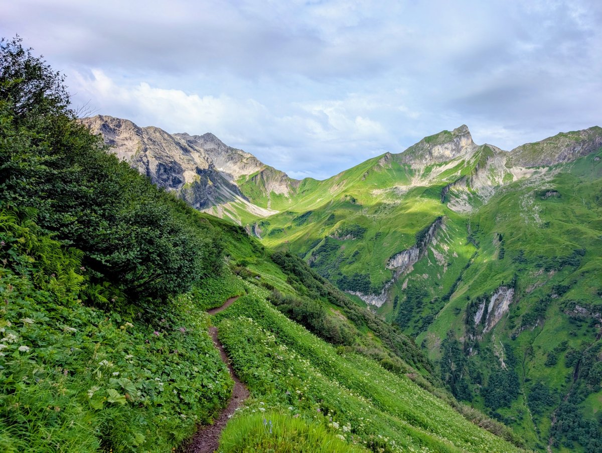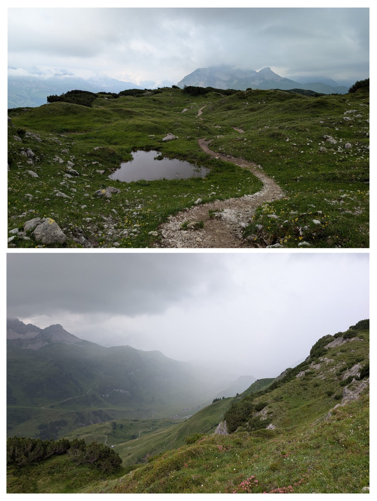 Nach diesem Erlebnis geht's hinüber nach Vorarlberg in Österreich zum Bregenzerwald. Der Weg bergab ist schlammig und rutschig, doch zum Glück gelingt mir dies mit meinen Stöcken gut auszugleichen und ich kann ohne Stürze oder Ausrutscher zum Hochtannbergpass absteigen.
