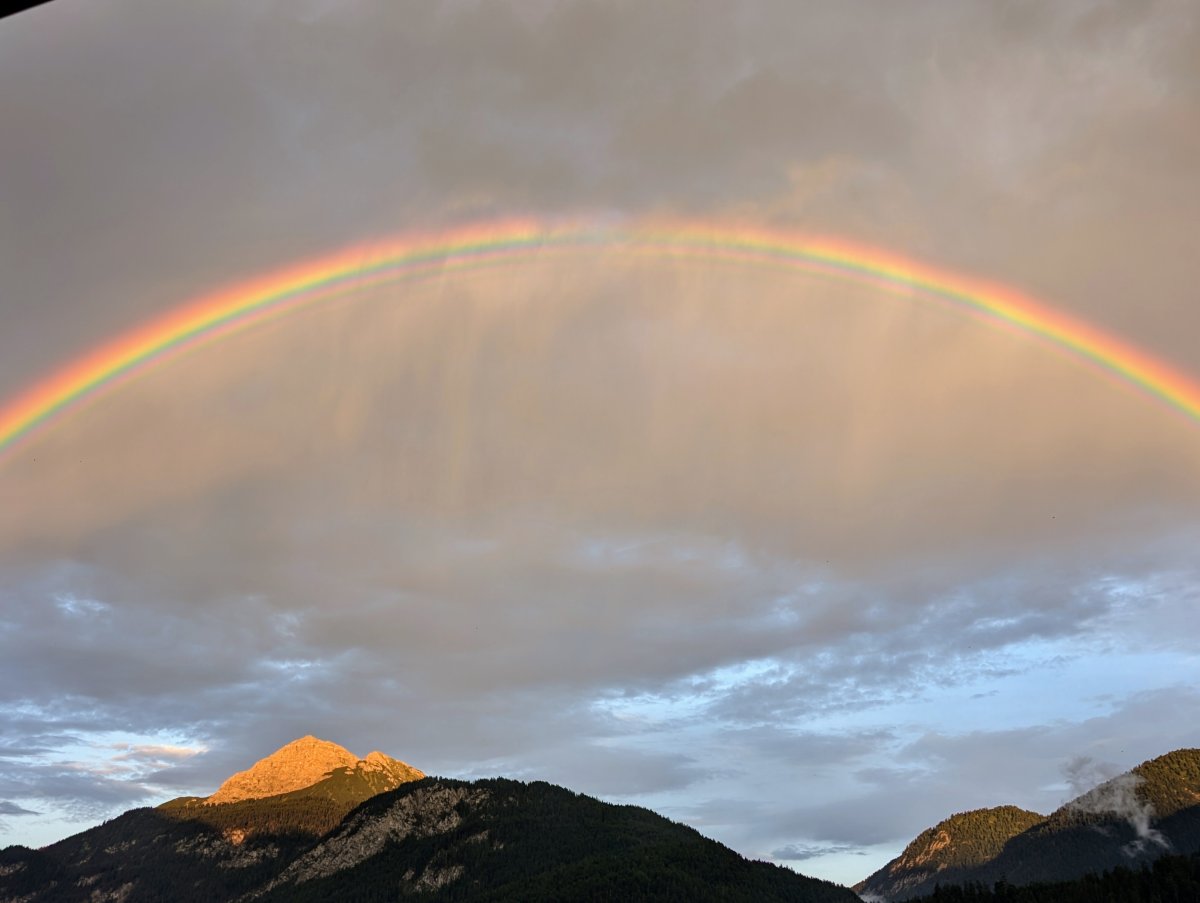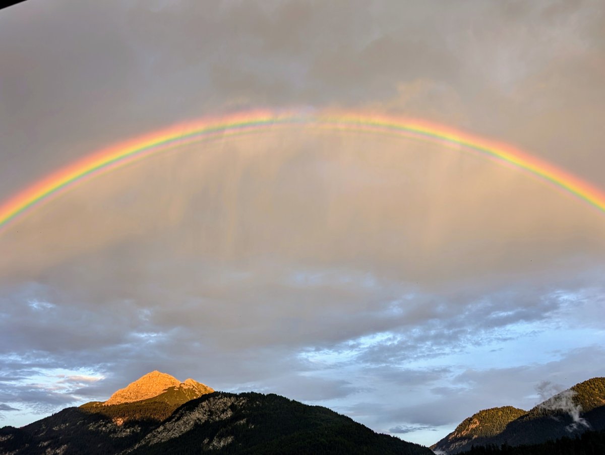Ich geniesse die Zeit beim Nachtessen und im gemütlichen, wohligen Zimmer. Später klart draussen der Himmel auf und ich darf von meinem Balkon aus einen wunderbaren Regenbogen beobachten.
