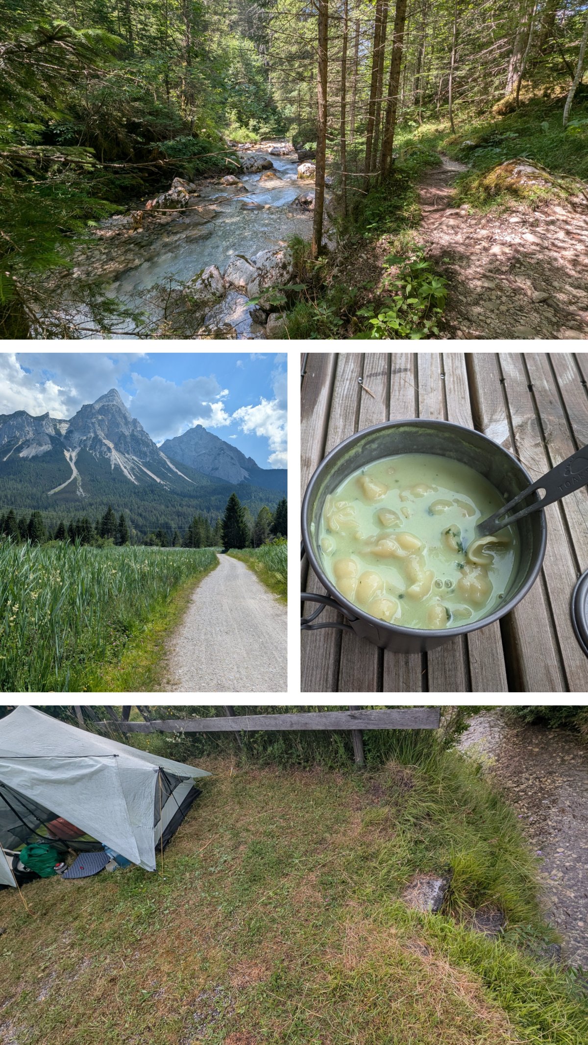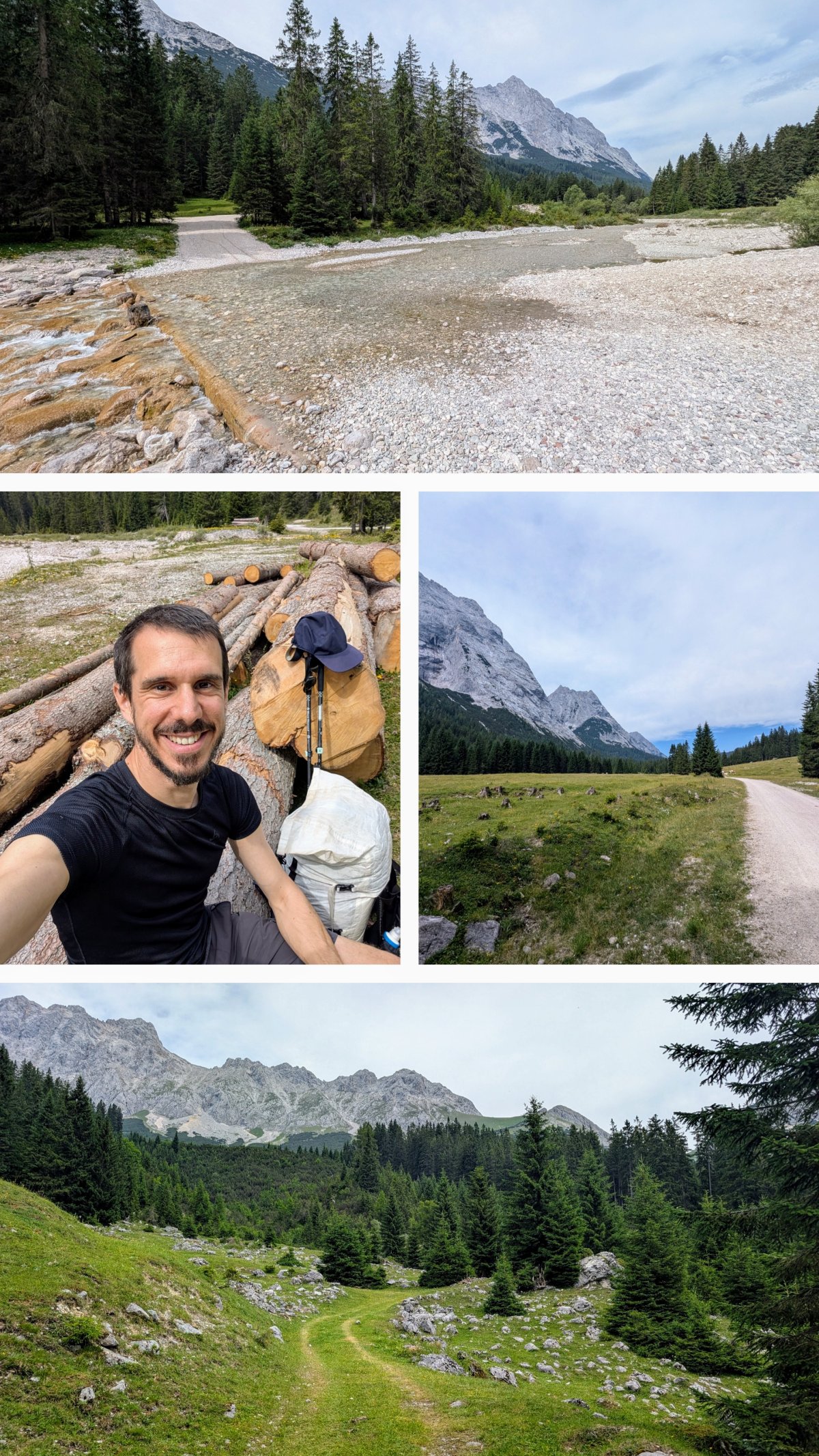 Heute starte ich spät, erst knapp nach neun Uhr laufe ich los. Der Weg führt mich heute durchs Gaistal auf die Ebene unterhalb der Zugspitze. Es geht vorbei an Flüssen, Almen und durch mehrere Viehweiden, hauptsächlich auf unspektakulären Forststrassen.