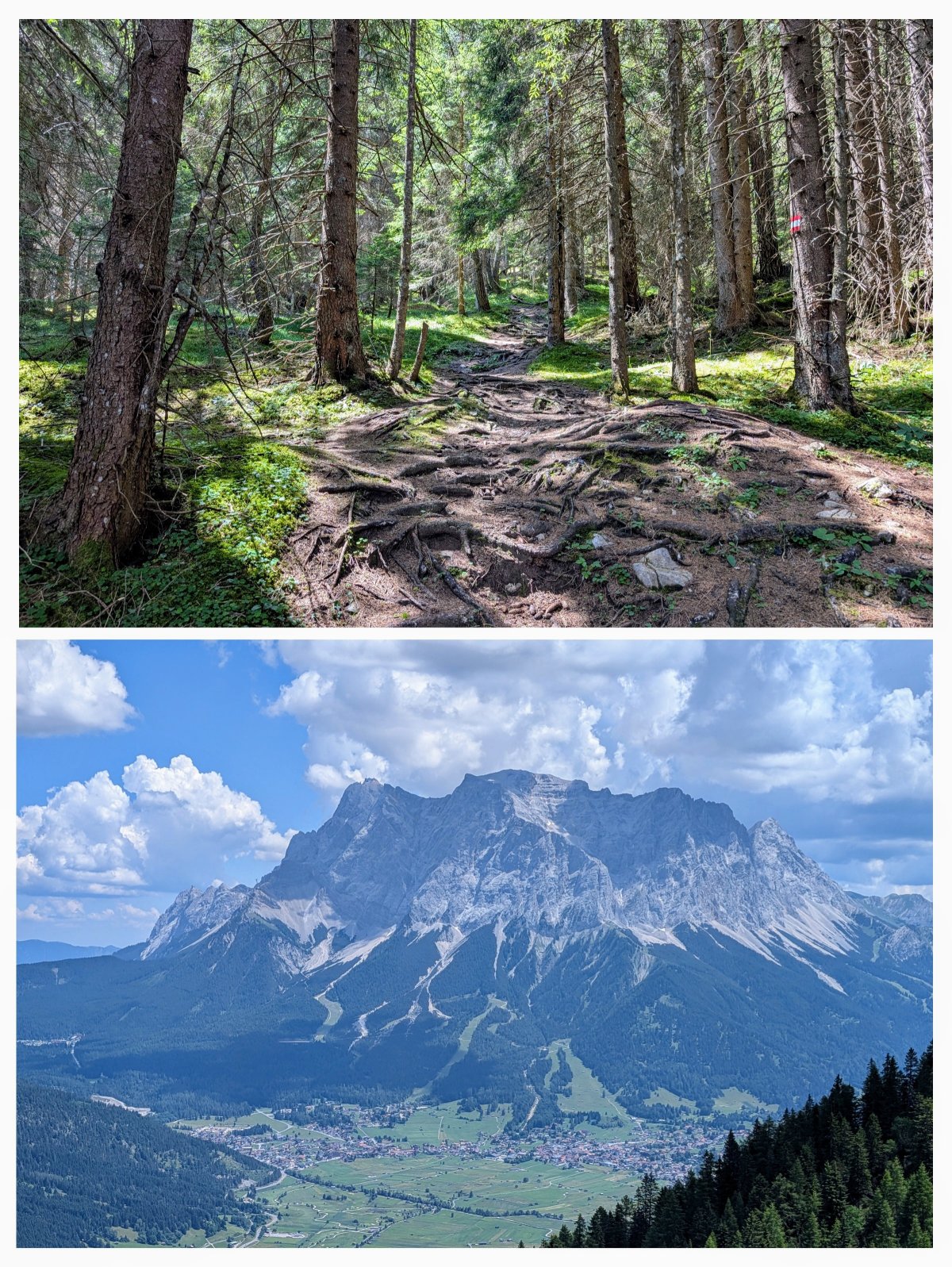 Am nächsten Morgen geht's nach meinem Frühstück los. Heute erwarten mich gemütliche neun Kilometer und achthundert Höhenmeter. So lasse ich mir wieder Zeit und spaziere über schattige Wege den Berg hoch und erhasche zwischendurch sogar einen wunderbaren Blick auf die Zugspitze.