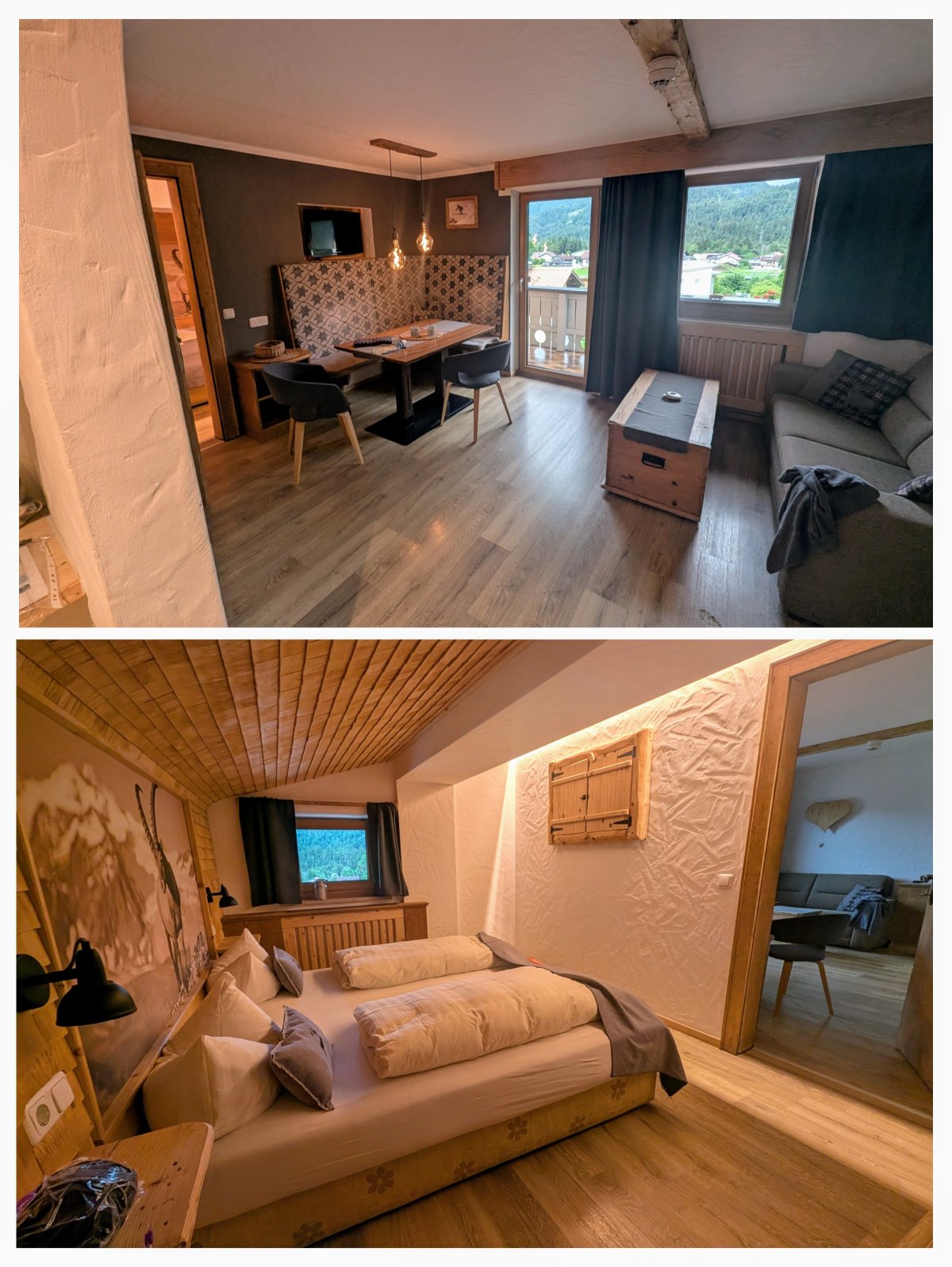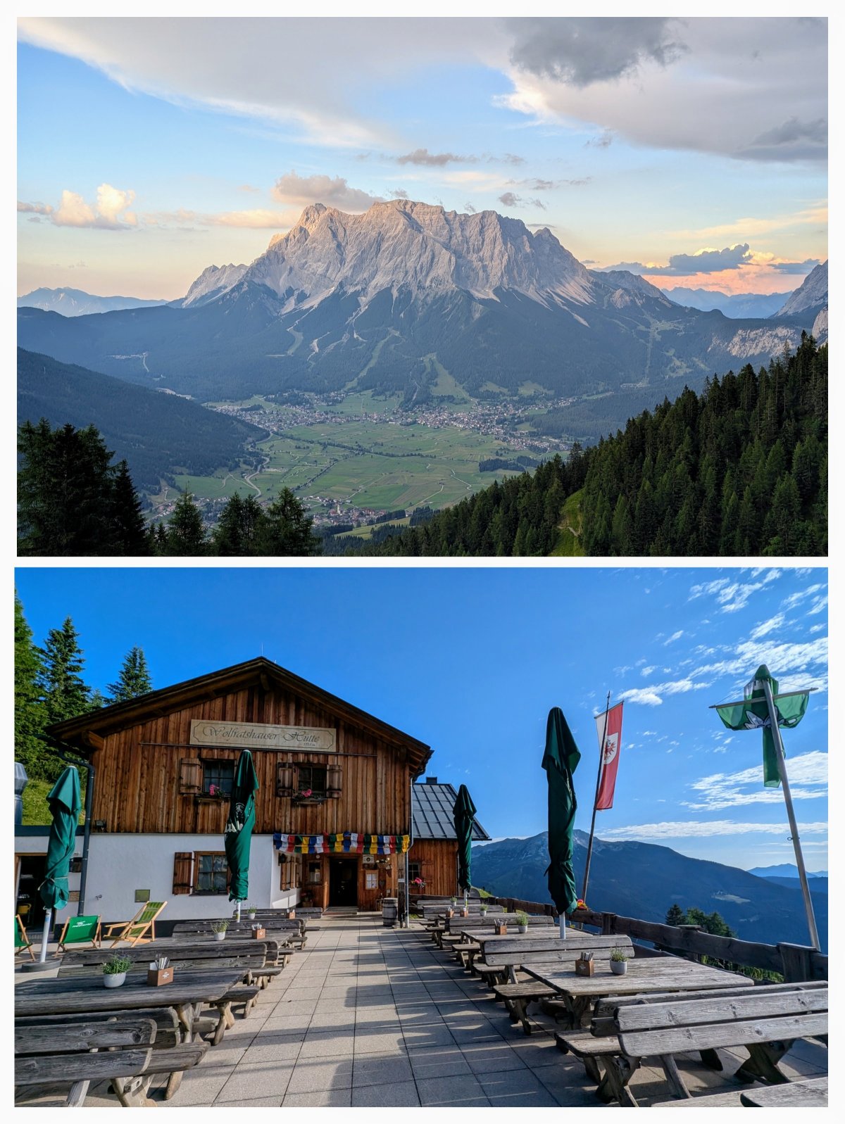 Am Nachmittag geniesse ich die Aussicht und schreibe an meinem Blog. Die Hüttenwirte erzählen mir, dass wir heute nur zu dritt seien und er mir deshalb sogar ein Upgrade auf ein Vierer-Zimmer geben kann, denn gebucht hätte ich das Lager. Ich freue mich besonders, denn mein Zimmer ist das Einzige mit direkter Sicht auf die Zugspitze.