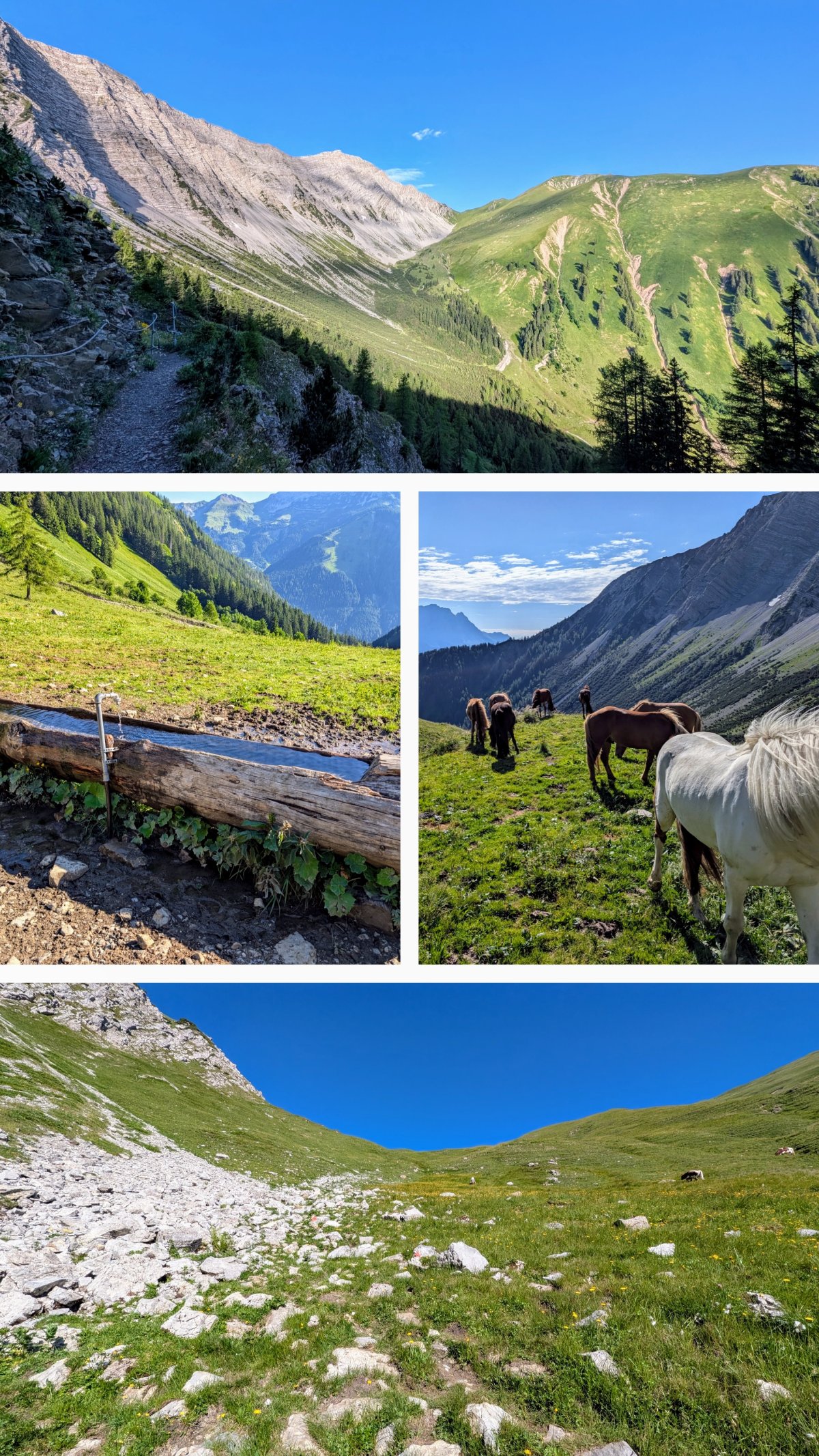 Nach dem Frühstück starte ich im Kurzarmshirt und steige über den Sattel hinter der Hütte in ein Seitental. Nach einer knappen Stunde, wechsle ich dann wieder auf mein Langarmshirt, denn meine Sonnencreme ist weggeschwitzt und die morgendliche Bewölkung hat sich auch aufgelöst.