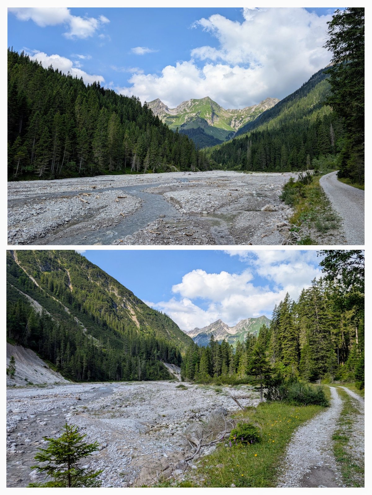 Am nächsten Morgen ist mein Zelt komplett feucht. Es hat stark abgekühlt und das Kondenswasser hat es innen und aussen in Beschlag genommen. So packe ich das Zelt nass ein, frühstücke mein Müsli und starte kurz nach sieben Uhr. Der Weg führt mich heute wieder zurück auf die Allgäuer Hochalpen, doch zuerst geht's entlang des “Stillbach” ins Tal hinein.