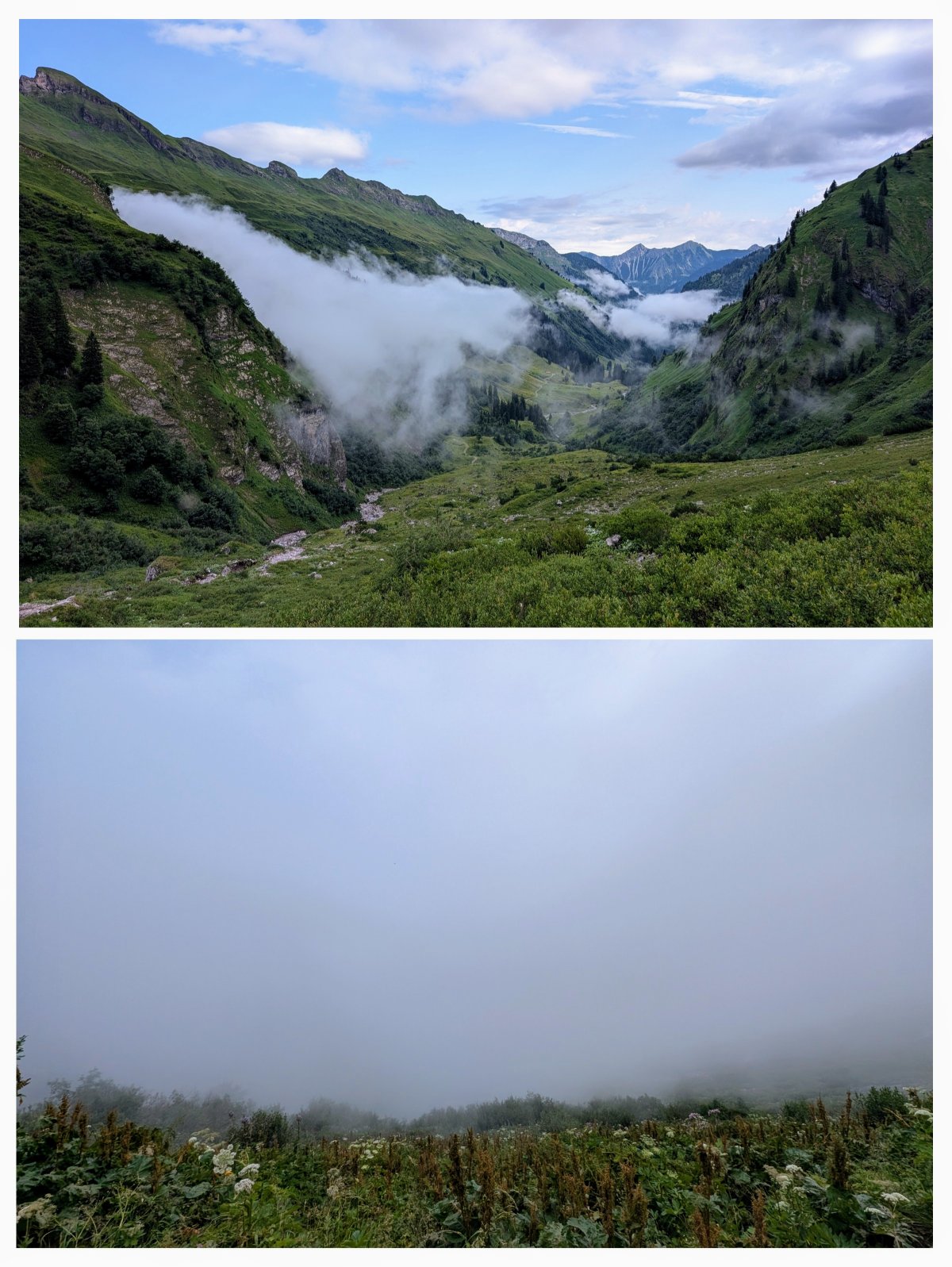 Der Nebel klebt im Tal an den Hängen. Ich beobachte den sich langsam bewegenden Nebel und steige auf zum Sattel. Keine drei Minuten später werde ich vom Nebel überrascht und bin von ihm komplett umhüllt. “Das ging jetzt erschreckend schnell”, sage ich zu anderen Wandernden, die ebenso erstaunt über die Situation sind.