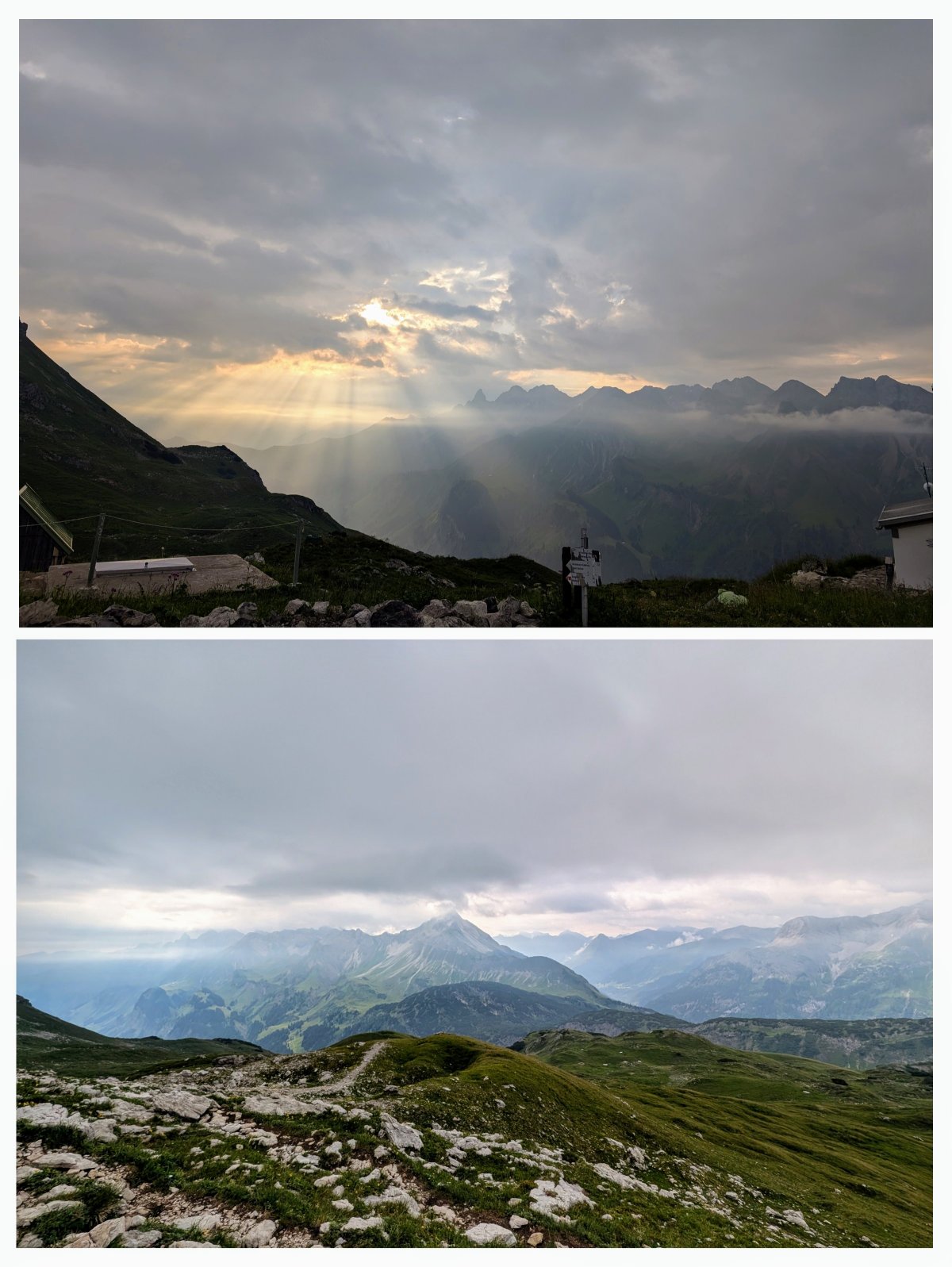 Am nächsten Morgen habe ich mir zehn Minuten vor Sonnenaufgang den Wecker gestellt. Gespannt warte ich mit offenem Fenster, bis die Sonne hinter den Bergen hervor blinzelt. Kurz nach zwanzig ab fünf treffen die ersten Strahlen bis zur Hütte und füllen das ganze Zimmer mit wunderbarem Licht.