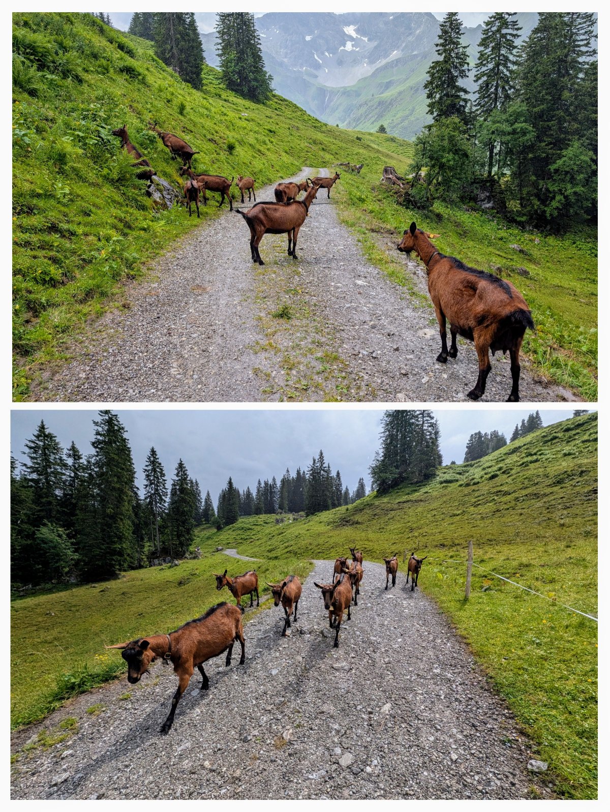 Auf dem Weg bergab habe ich unerwartet neun Begleiter, die mir ganze zehn Minuten auf Schritt und Tritt folgen. Ich bin umzingelt von Ziegen und fühle mich wie ihr Hirte. Bleibe ich stehen, bleiben sie auch stehen, gehe ich weiter, tun sie dasselbe. Ich mache mir ein kleines Spiel daraus und habe dabei meinen Spass. Ob sie dasselbe empfunden haben, konnte ich bis zuletzt leider nicht herausfinden. 🙃