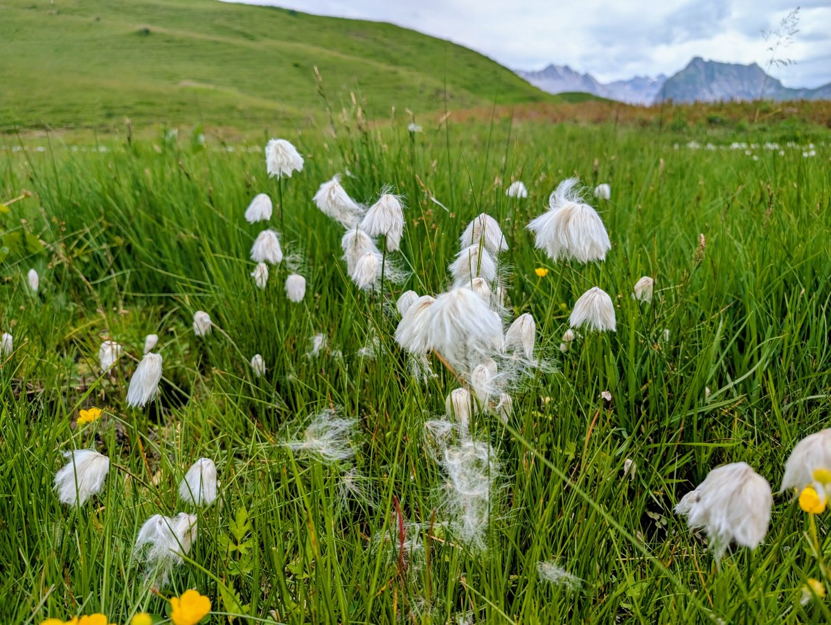 Kurz vor der Hütte entdecke ich eine Pflanze, die ich so noch nie gesehen habe. Es handelt sich um Wollgras, wie ich später erfahre. Das ganze Moor ist damit bedeckt und bietet einen einzigartigen Anblick.