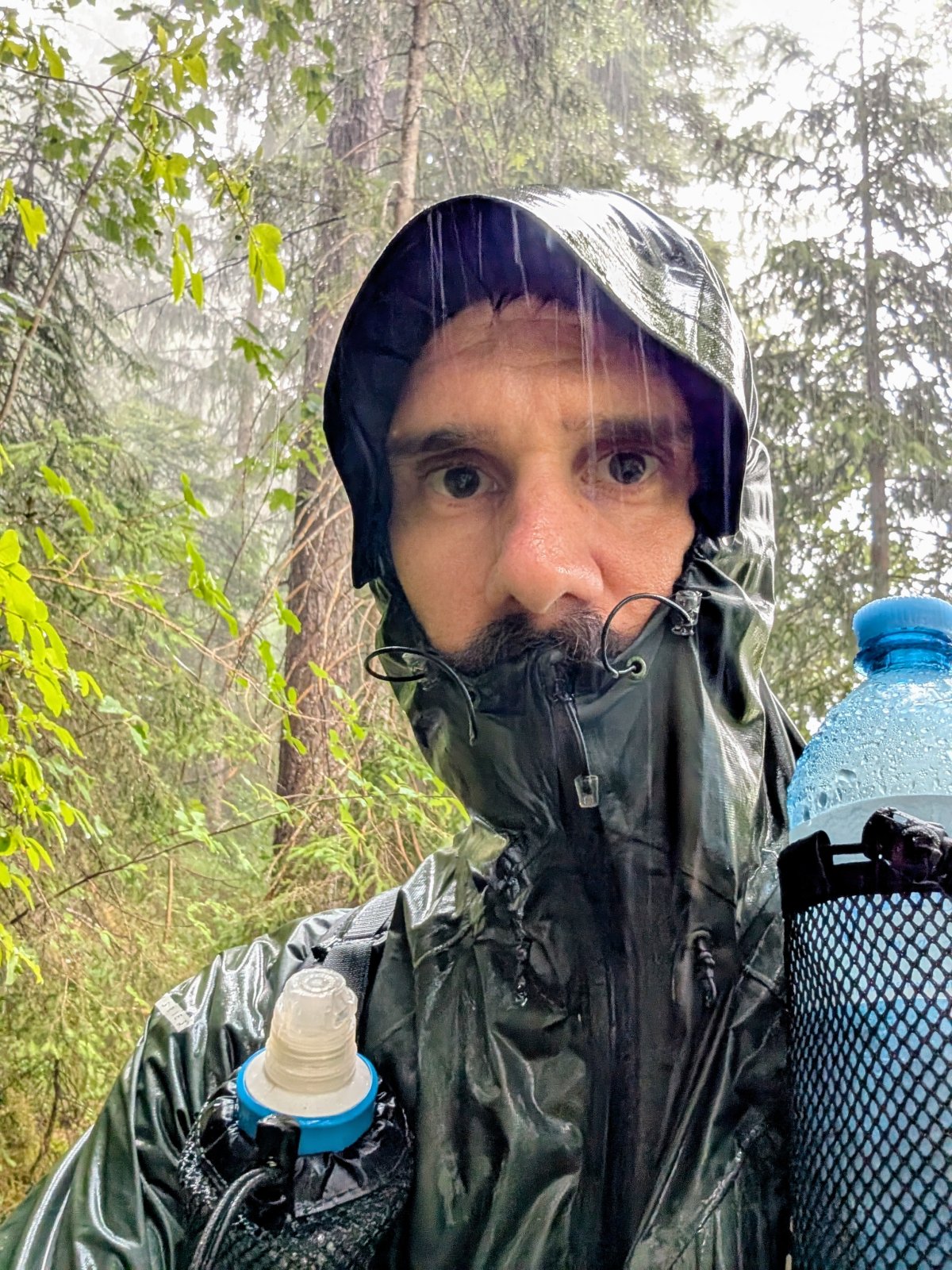 Es schüttet aus Eimern und ich entscheide mich, zügig weiterzugehen. Die Gewitterzelle hat mittlerweile abgedreht und rollt rechts von mir vorbei, doch sie ist mir immer noch zu nahe und so versuche ich mich in “Sicherheit” zu bringen so gut es geht. Ich lege meine Stöcke weit weg und gehe in die Hocke, stelle meine Füsse nahe zueinander und warte ab. Der Wind peitscht mir grosse Regentropfen ins Gesicht und es vergehen bange Minuten. Nach einer gefühlten Ewigkeit ist die Zelle endlich vorbeigezogen und ich getraue mich wieder langsam aufzustehen.