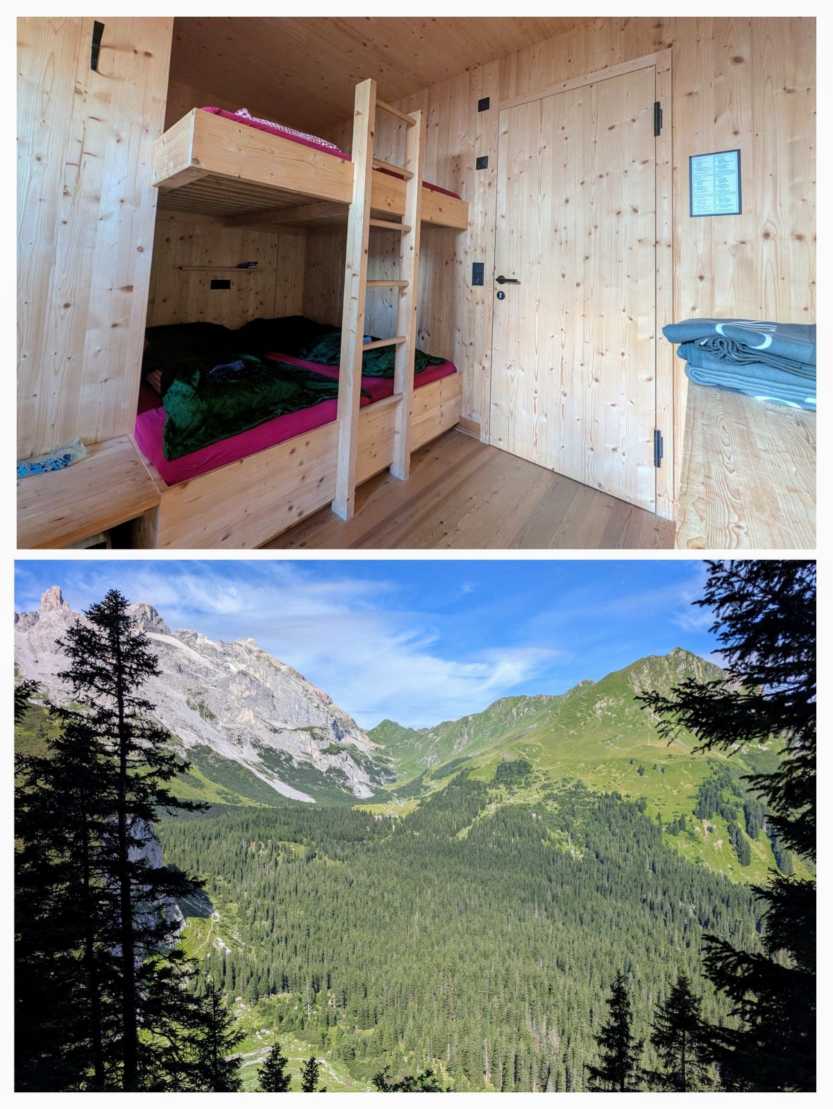 Am frühen Nachmittag treffen wir an unserem Tagesziel, der Lindauer Hütte, ein. Eine grosse und topmoderne Hütte, wunderbar gelegen inmitten von einem Nadelwald. Wir haben ein Vierbettzimmer und sind die Ersten. So können wir uns die Betten aussuchen. Später kommen noch zwei ältere, rüstige Herren zu uns ins Zimmer. Da wir die Betten unten gewählt haben, müssen die beiden oben Platz nehmen. Anfänglich haben wir kurz ein schlechtes Gewissen, doch die beiden sind fit und kommen ohne grosse Schwierigkeiten hoch.