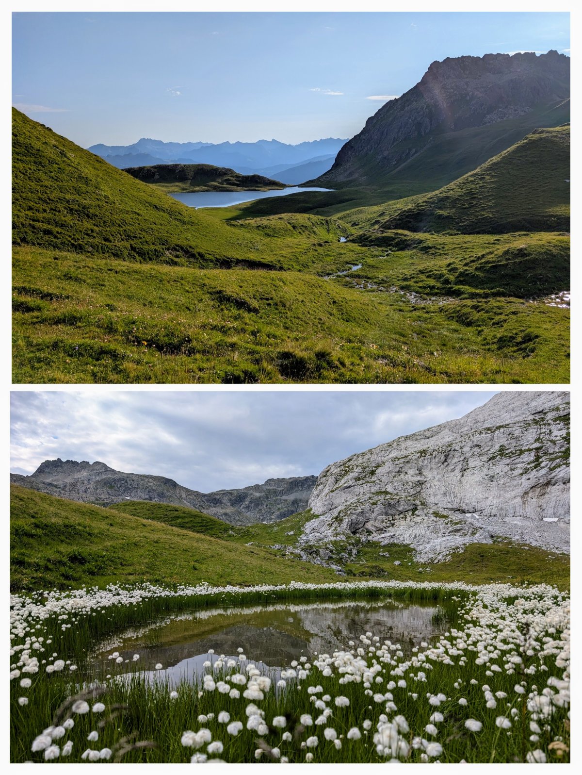 Der nächste Morgen beginnt mit viel Sonnenschein und unseren hungrigen Mägen. Nach einem ausgiebigen Frühstück verabschieden wir uns von Jessy und Aline, schnüren unsere Schuhe und starten. Der Weg führt uns zuerst auf die andere Seite um den See und dann seitlich in ein Tal, hinauf zum Verajoch.