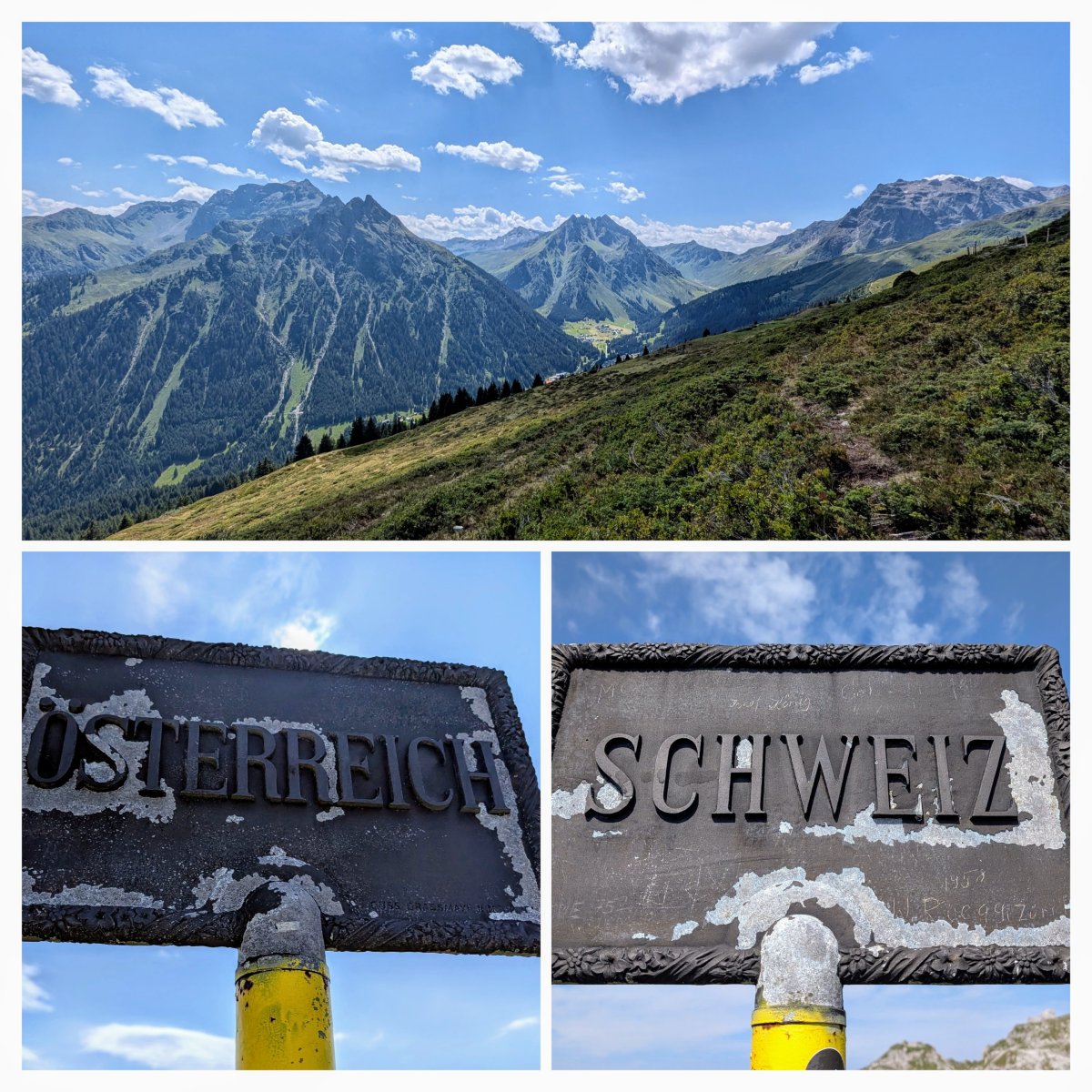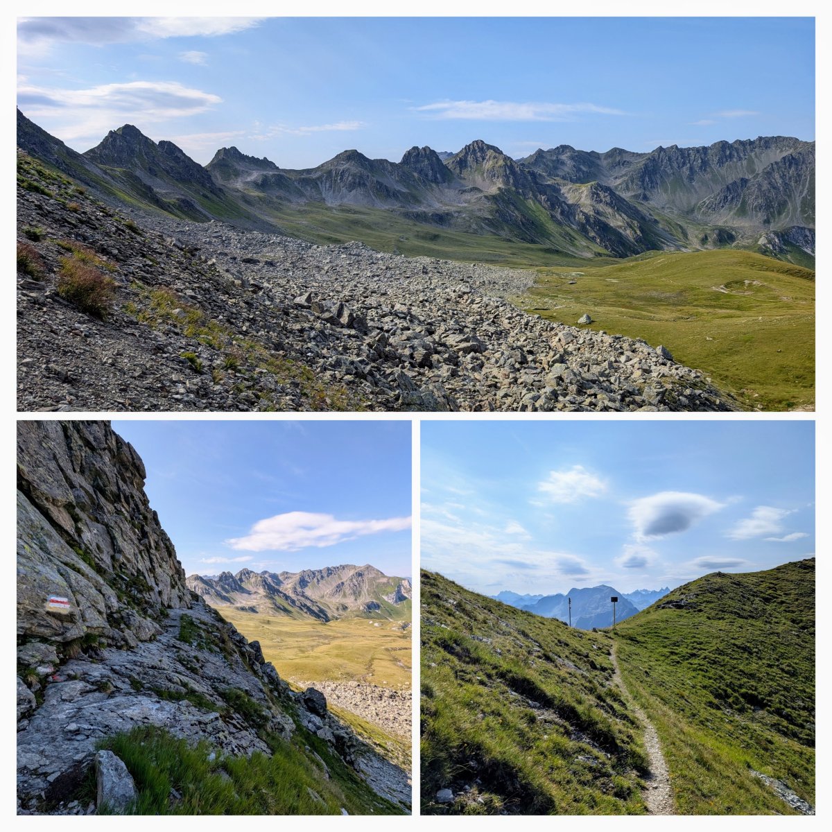 Nach guten vier Kilometern Weg sind wir beim Plasseggenpass und überqueren die Grenze zur Schweiz. Nun geht es für knappe dreissig Minuten über Geröllfelder durch die Schweiz und beim Sarotlapass wieder zurück nach Österreich.