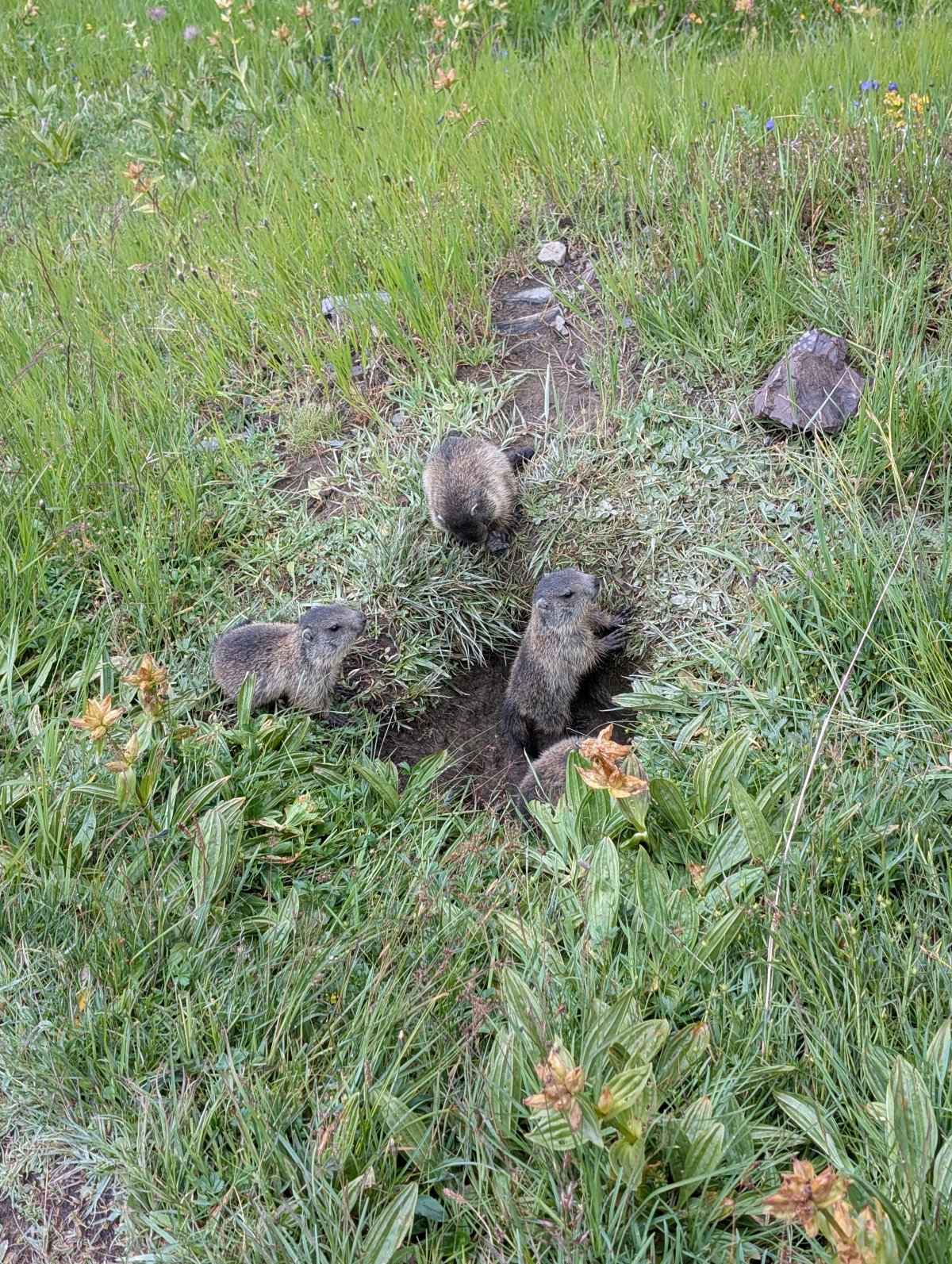 Schon nach rund einer Stunde entdecken wir “Murmelis”, circa zwanzig Meter vor uns, direkt neben dem Wanderweg. Wir laufen weiter und nähern uns beinahe lautlos und ganz langsam. So gelingt es, ohne dass sie in ihrem Bau verschwinden, uns bis auf einen Meter anzunähern. Wir zählen insgesamt vier Stück und sind so fasziniert, dass wir uns nicht getrauen zu bewegen und nur wenige Worte flüsternd miteinander austauschen.
