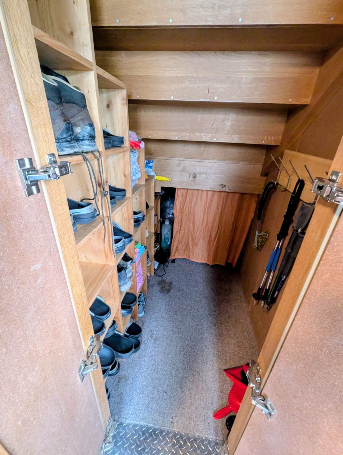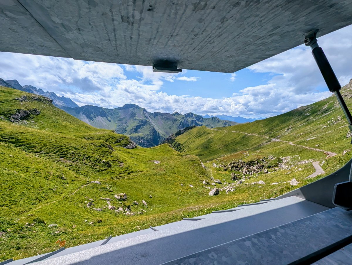 Nach der Grenze geht's bergab, vierhundert Höhenmeter tiefer zur Schesaplanahütte. Vor der Hütte treffen wir wieder Jessy und Aline, die, wie wir gestern herausgefunden haben, bis morgen dieselbe Route wandern wie wir. Drinnen in der Hütte frage ich beim Check-in nach einem Trocken- oder Schuhraum, dabei entdecken wir den wohl kleinsten Schuhraum, den ich bisher auf einer Hütte gesehen habe. Wir beziehen unsere gemütlichen Betten im Nebenhaus und richten uns ein.