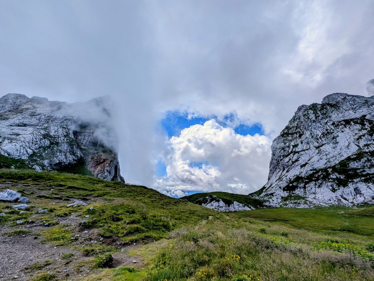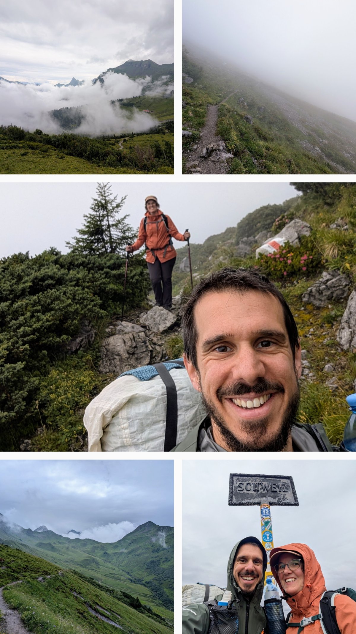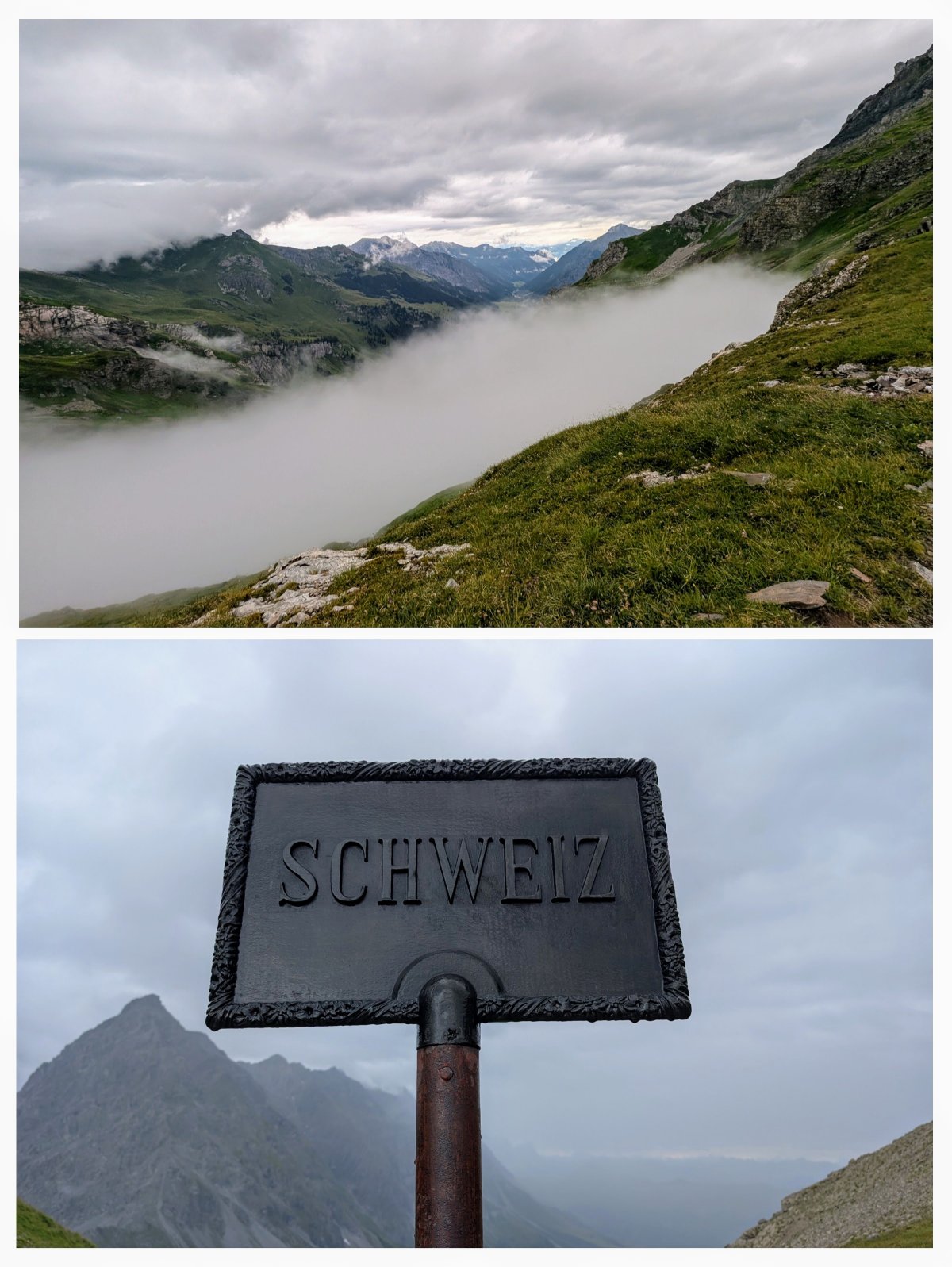 Der Weg führt uns weiter über das “Gross Furgga Hochjoch” auf über zweitausend dreihundert Meter über Meer hinüber in die Schweiz. Das Wetter spielt mit und hat uns bisher mit Regen verschont, obwohl es Wolken unter- und oberhalb von uns hat. Wir sind sozusagen zwischen den Wolken unterwegs.