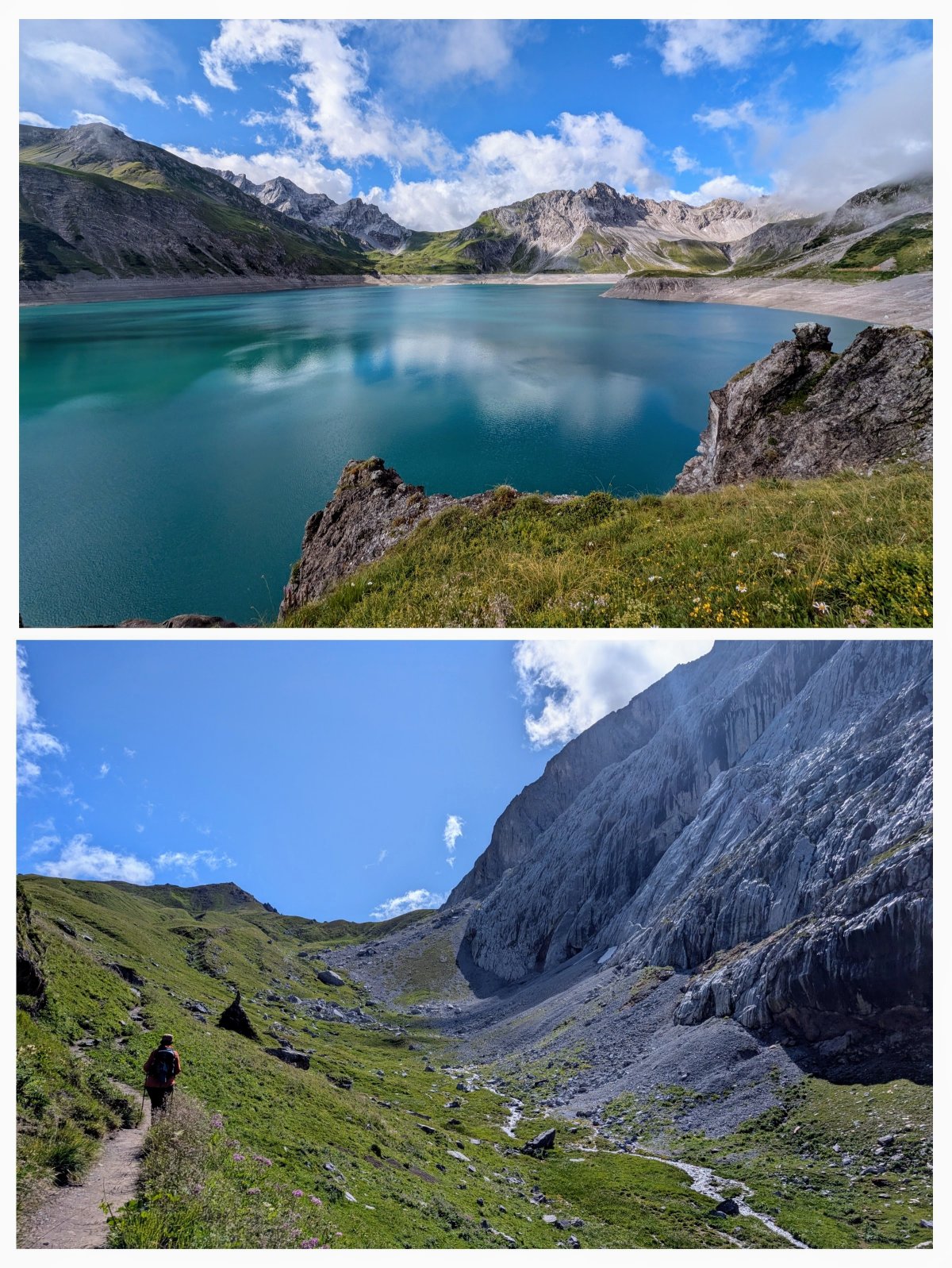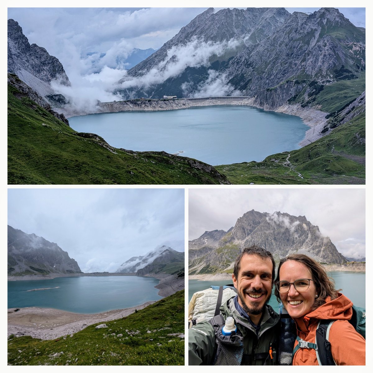 So ziehen wir schnell weiter, hinab auf die österreichische Seite zum Lünersee. Kurze Zeit später und einige Höhenmeter weiter unten lichtet sich der Nebel und wir haben wunderbare Sicht auf auf den See.