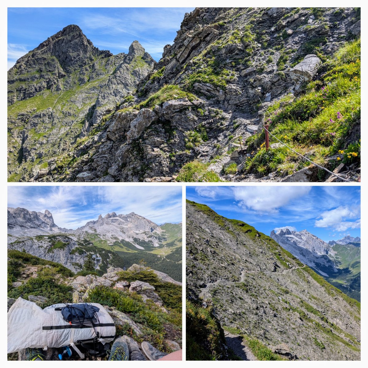 Wir kommen gut voran und haben im oberen Teil des Anstiegs eine wunderbare Weitsicht auf die “Drei Türme” und den "Öfapass", worüber wir gestern zur Hütte abgestiegen sind.