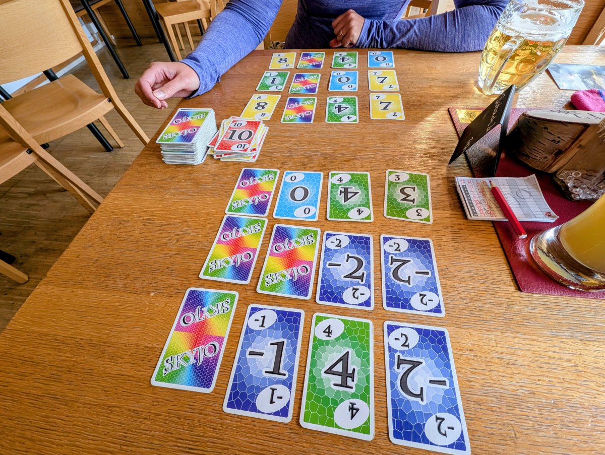 Die Hütte ist direkt mit der Seilbahn von einem Parkplatz im Tal erreichbar und hat daher nicht denselben Charme wie andere Berghütten. Wir fühlen uns trotzdem wohl und spielen in der Hüttenstube “Skyjo” miteinander.